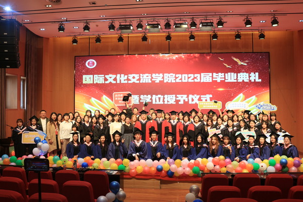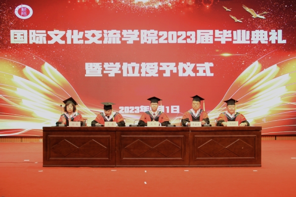 典礼上,关明常委和学院领导为93名毕业生拨穗正冠,颁发学位证书并送上精心准备的毕业纪念品。关明常委向毕业生送上了诚挚的祝福,并向大家寄予了深切的希望,希望大家能够胸怀家国之情,承担起青年一代人的使命,凸显出年轻人的责任和担当,踏浪前行;希望大家要坚定文化自信,继续深耕中华文化的价值意蕴,促进中华文化传播,深化文明交流互鉴,为加强中华文化的国际传播能力建设凝聚青春力量;希望大家心怀梦想,勇敢出发、求索真理、永攀高峰。随后,硕士研究生导师代表胡炯梅老师、本科班主任李娜老师和李睿老师发表讲话,表达对毕业生的祝贺以及美好期望。毕业生代表刘文瀚、韩雪瑶和热娜•努尔布拉提同学依次表达了毕业感言。最后,学院党委书记李嘉东老师为全体毕业生送上亲切的祝福,祝愿每一位毕业生志存高远、前程似锦。