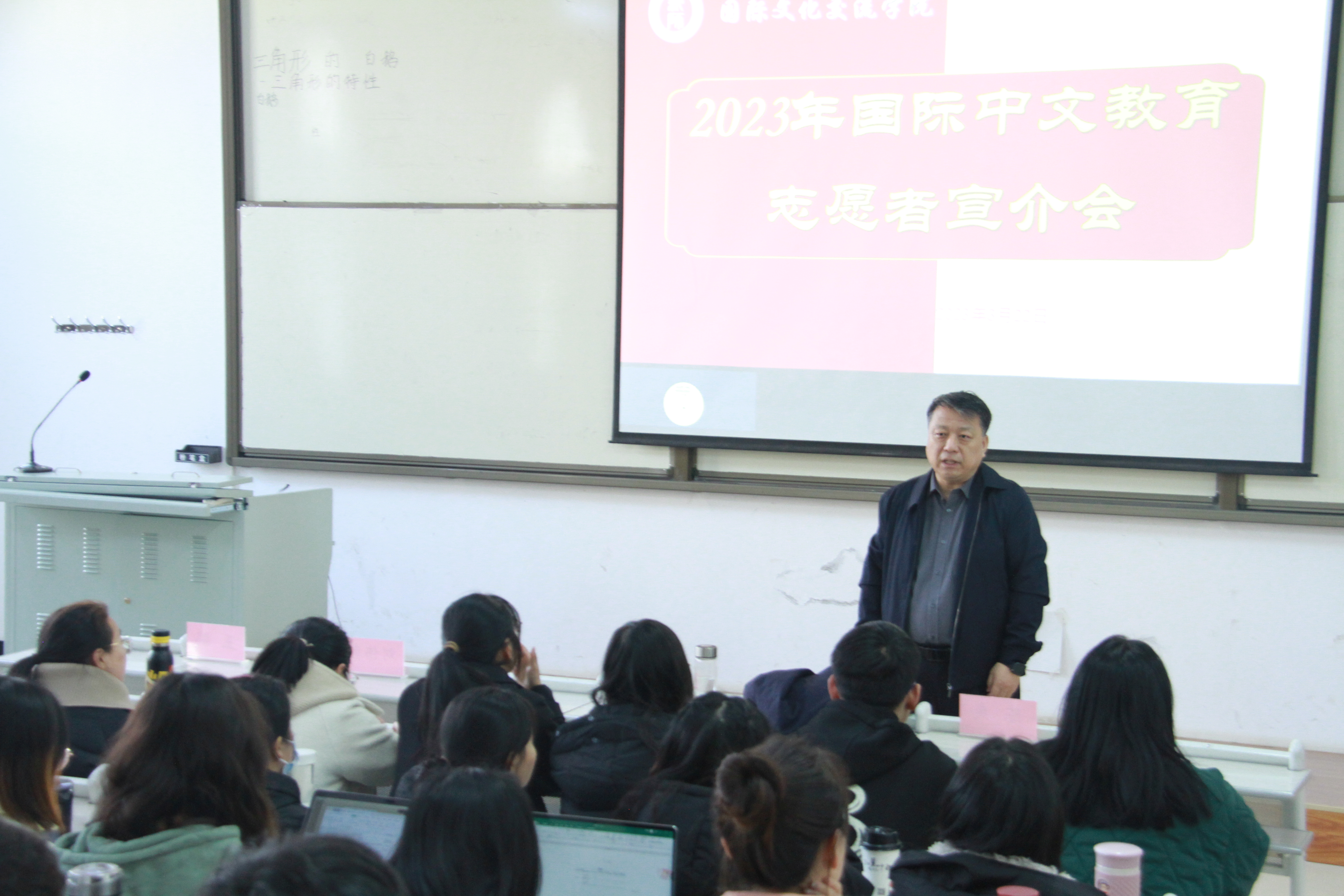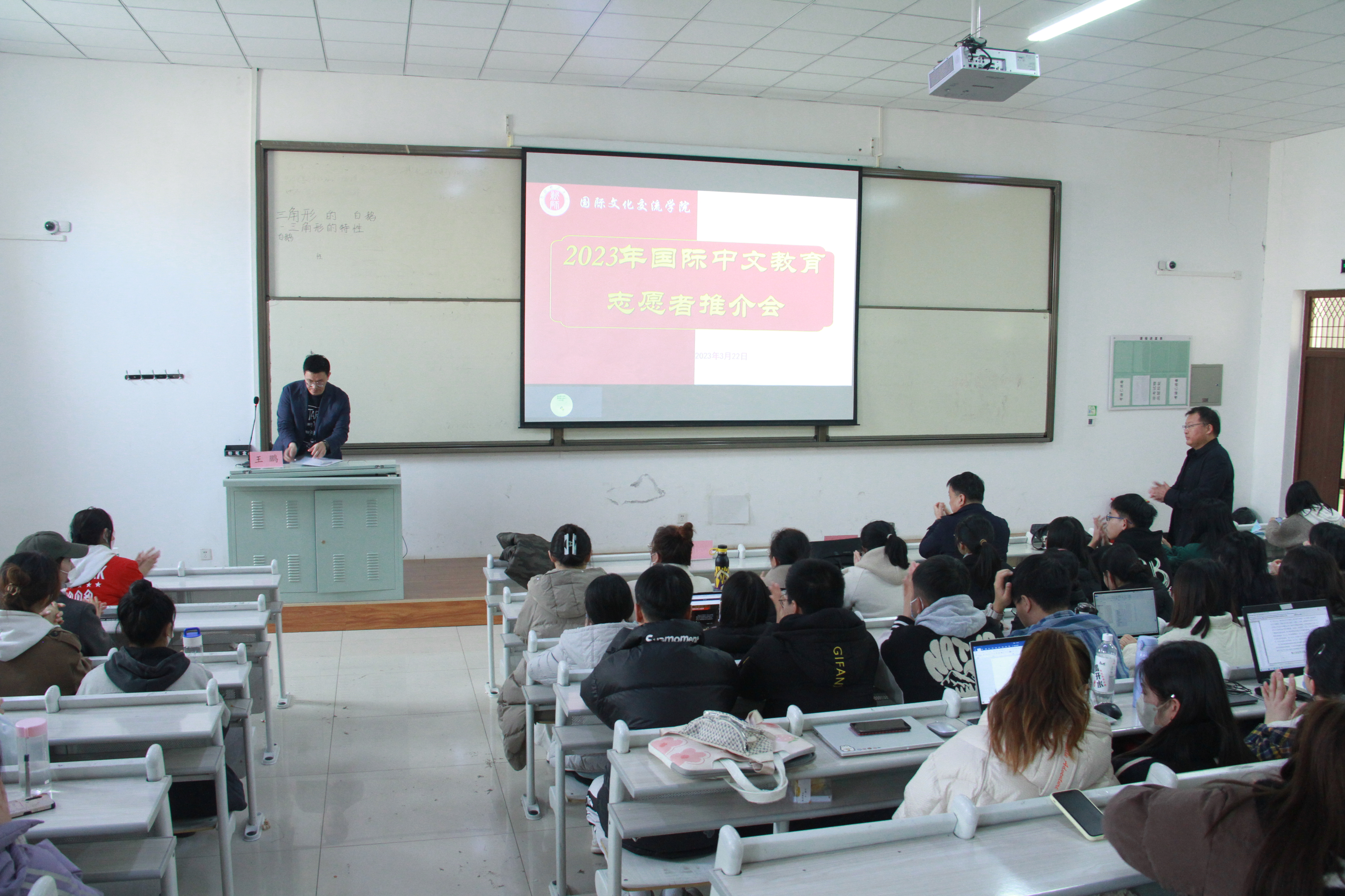 在3号教学楼106教室召开了2023年出国留学和国际中文教育志愿者项目宣介会,特别邀请了我校国际合作与交流处王鹏老师作宣讲。院党委书记李嘉东,副院长刘伟乾、陈爽,学院辅导员以及研究生和大三、大四本科生参加了会议。会议由辅导员何娜老师主持。