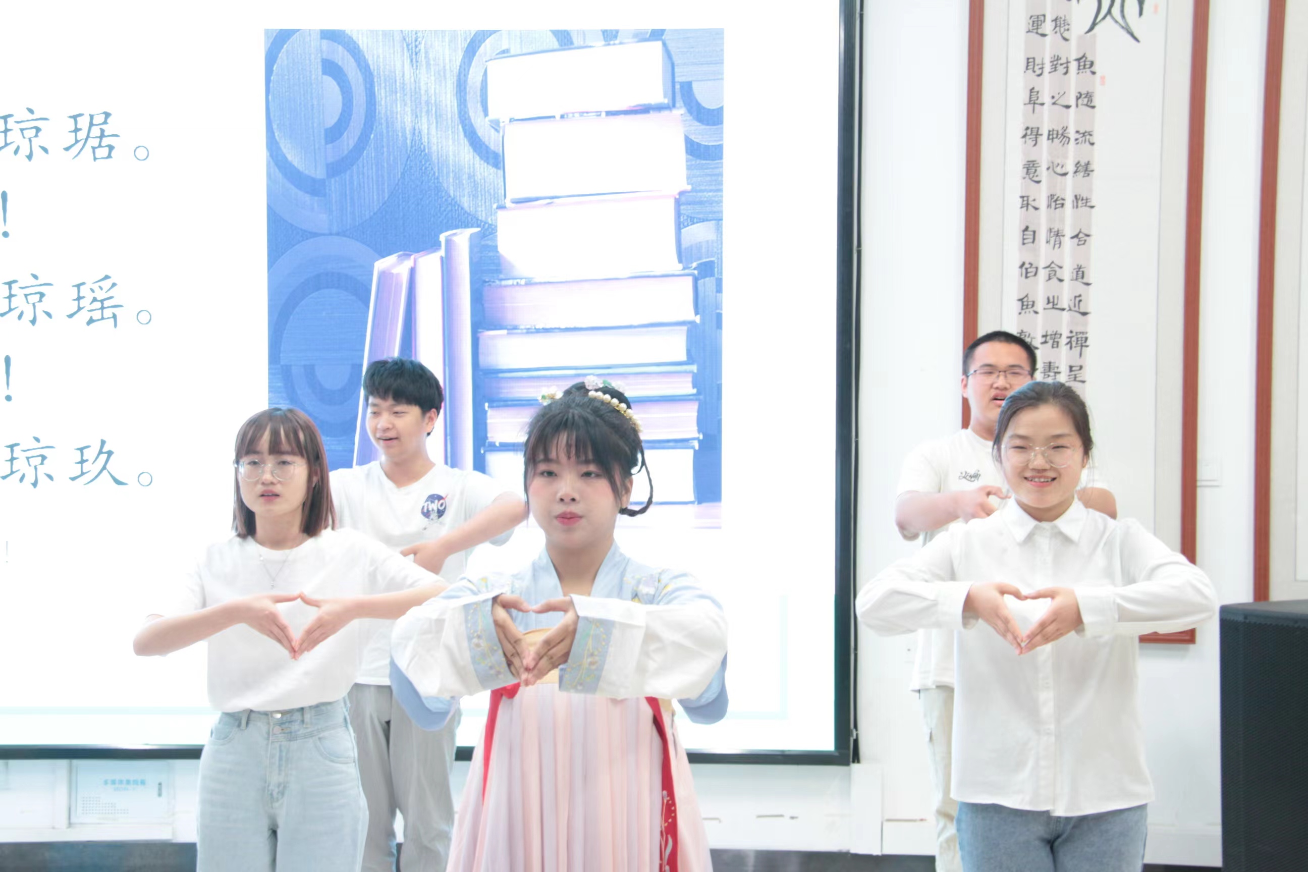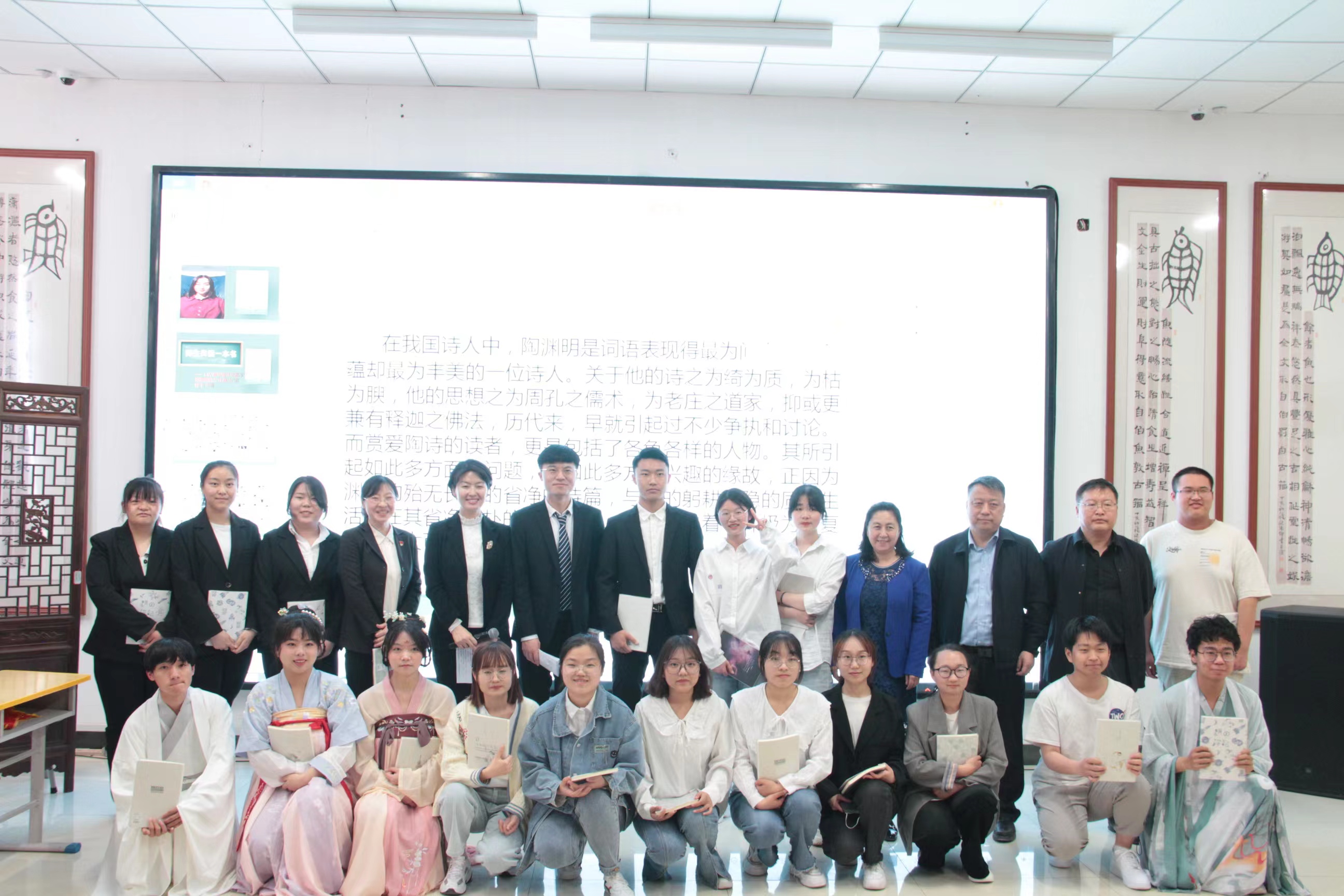 学院吟诵社的同学们吟诵了《木瓜》,留学生通过线上分享了她朗读的《静夜思》。在“师生共读一本书”中,班主任李娜老师带领同学们共读《从豪华落尽见真淳,论陶渊明之“任真”与“固夯”》,最后张桂梅校长朗读的《红岩》视频节选以及全体师生共读诗人艾青的《我爱这土地》,将读书会推向了高潮。