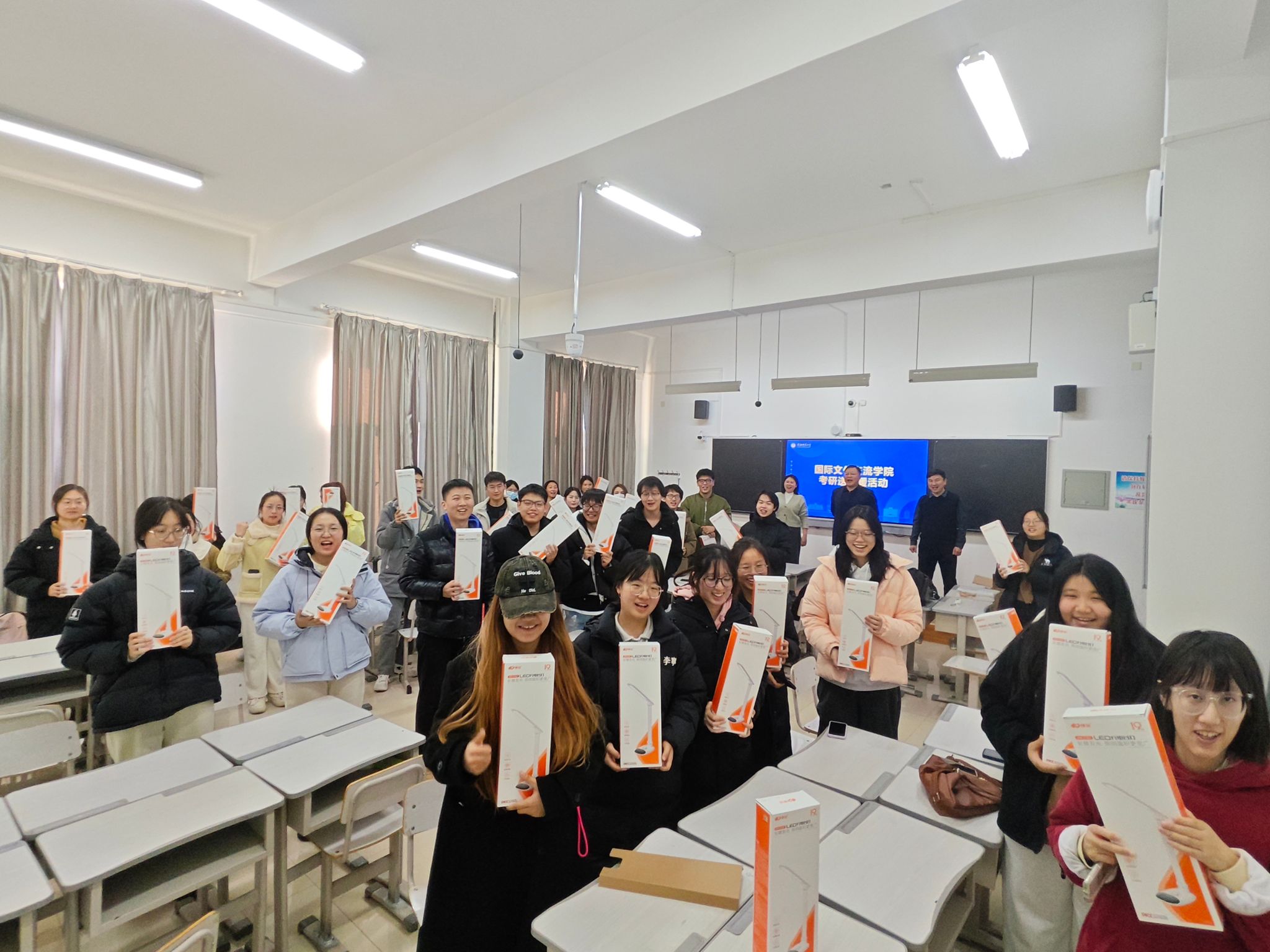 活动开场,胡炯梅教授鼓励大家在最后不到两个月的时间里要稳住心态、全力冲刺。刘伟乾副院长也代表学院送上“最强应援”,表示学院始终是大家的备考后盾,绝不掉线!最暖环节来了,学院为每位考研人准备了定制版充电台灯,寓意“点亮前路,电量满格”。一份礼物、百分祝福,陪伴每一个挑灯夜战的考研学子。