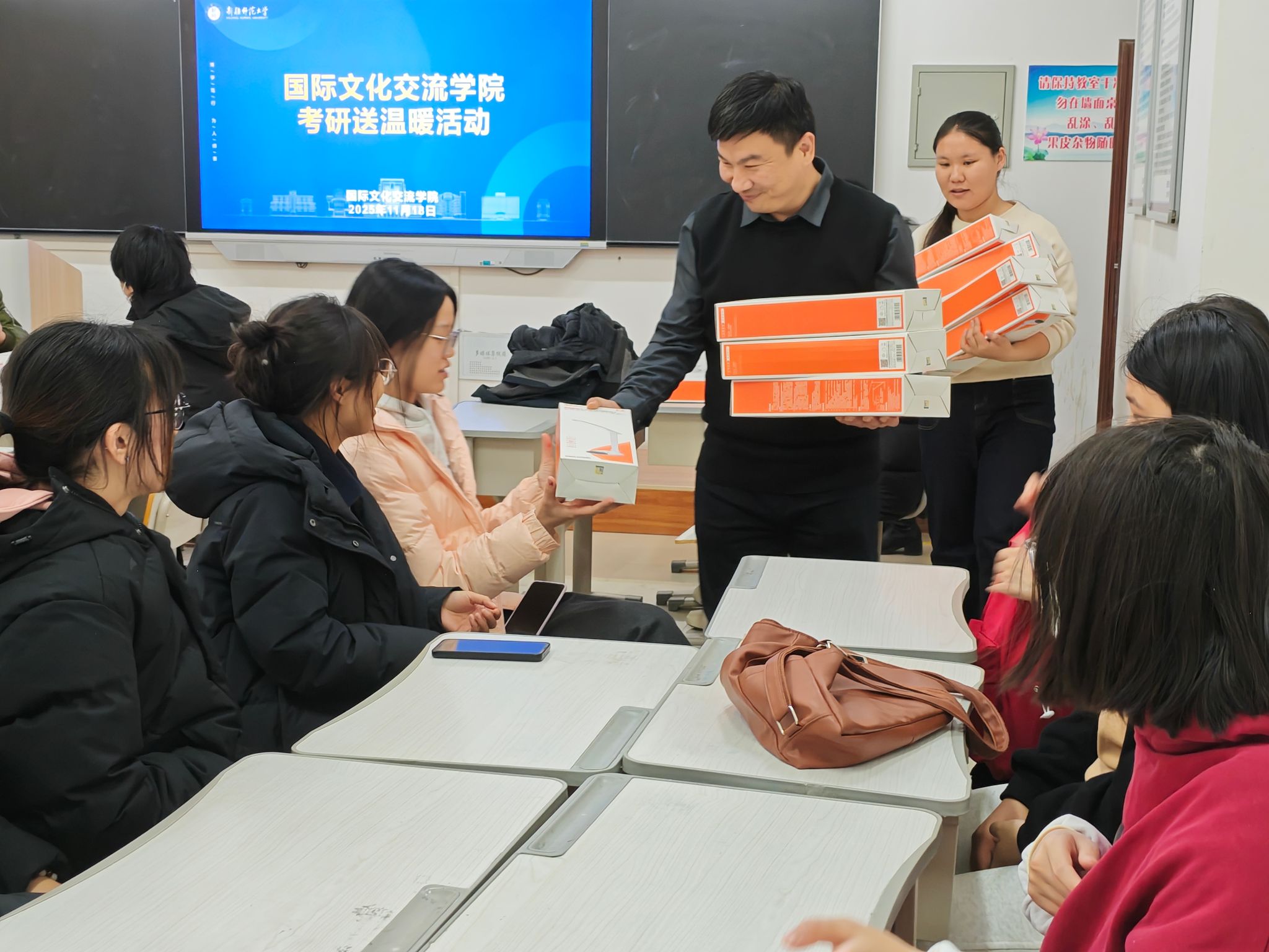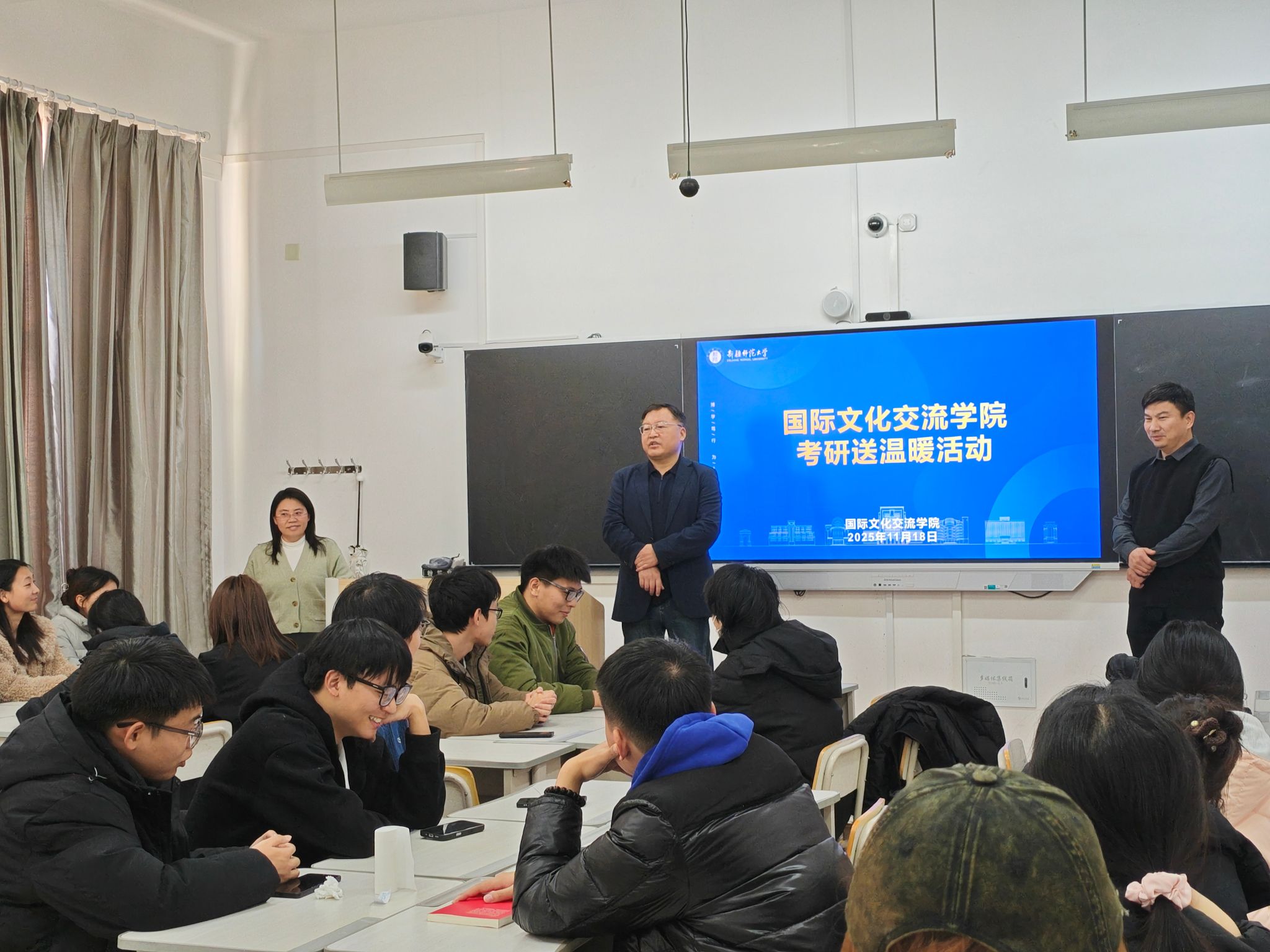 在二号教学楼310室为2026届考研人独家定制了一场“暖心充电”行动,学院党委副书记王辰、副院长刘伟乾和胡炯梅教授齐聚现场,为正在冲刺的考研人送上暖心关怀和能量补给!