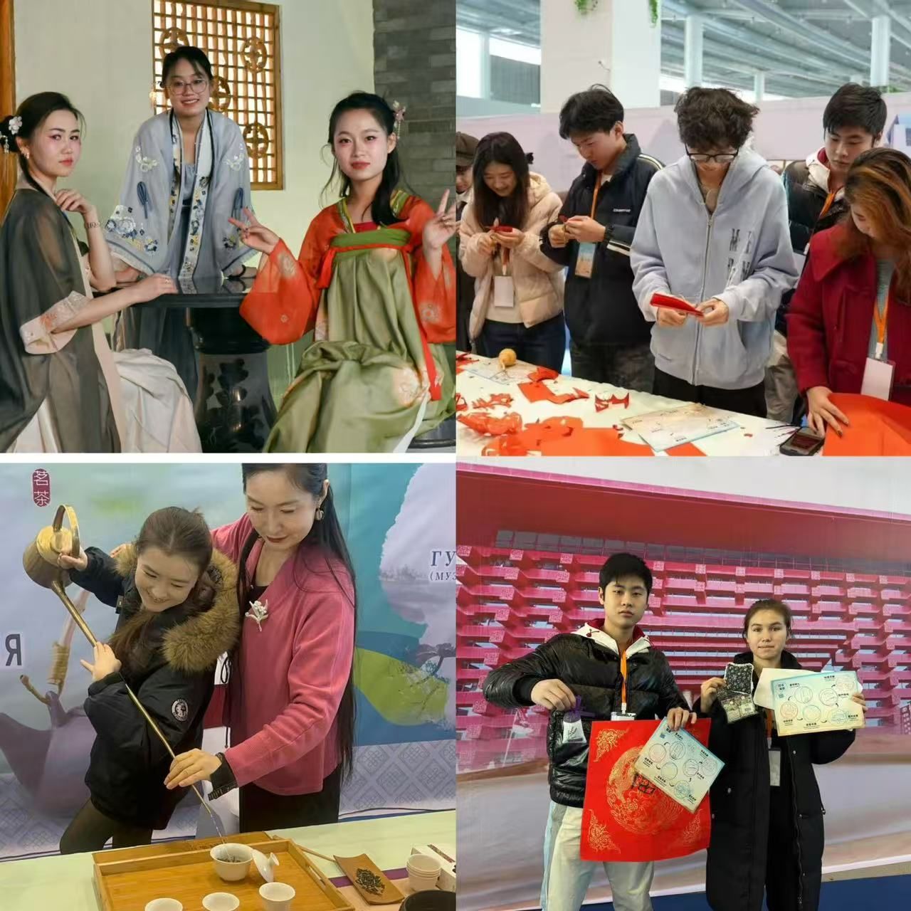 哈萨克斯坦留学生阿伊布拉提围绕“文化传承与青年创新”进行主题发言,吉尔吉斯斯坦留学生马飞、哈萨克斯坦留学生朗鸿与中国学生常静静也共同探讨“青年在跨文化交流中的责任与担当”,分享在华学习感悟与文化传播体会,彰显“美美与共”的交流理念。同学们还通过多种实践形式亲身体验中华文化,在非遗互动区尝试书法、剪纸与民乐演奏;在中医馆学习八段锦、体验刮痧、品尝药茶,感受中医药文化智慧。此外,乐球直播