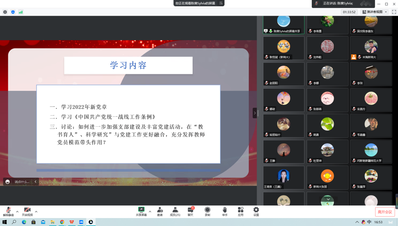20221123日,乐球直播 教师党支部组织全体党员教师开展了线上“党旗映天山”主题党日活动。会议由支部书记陈爽主持,全体党员教师参会。