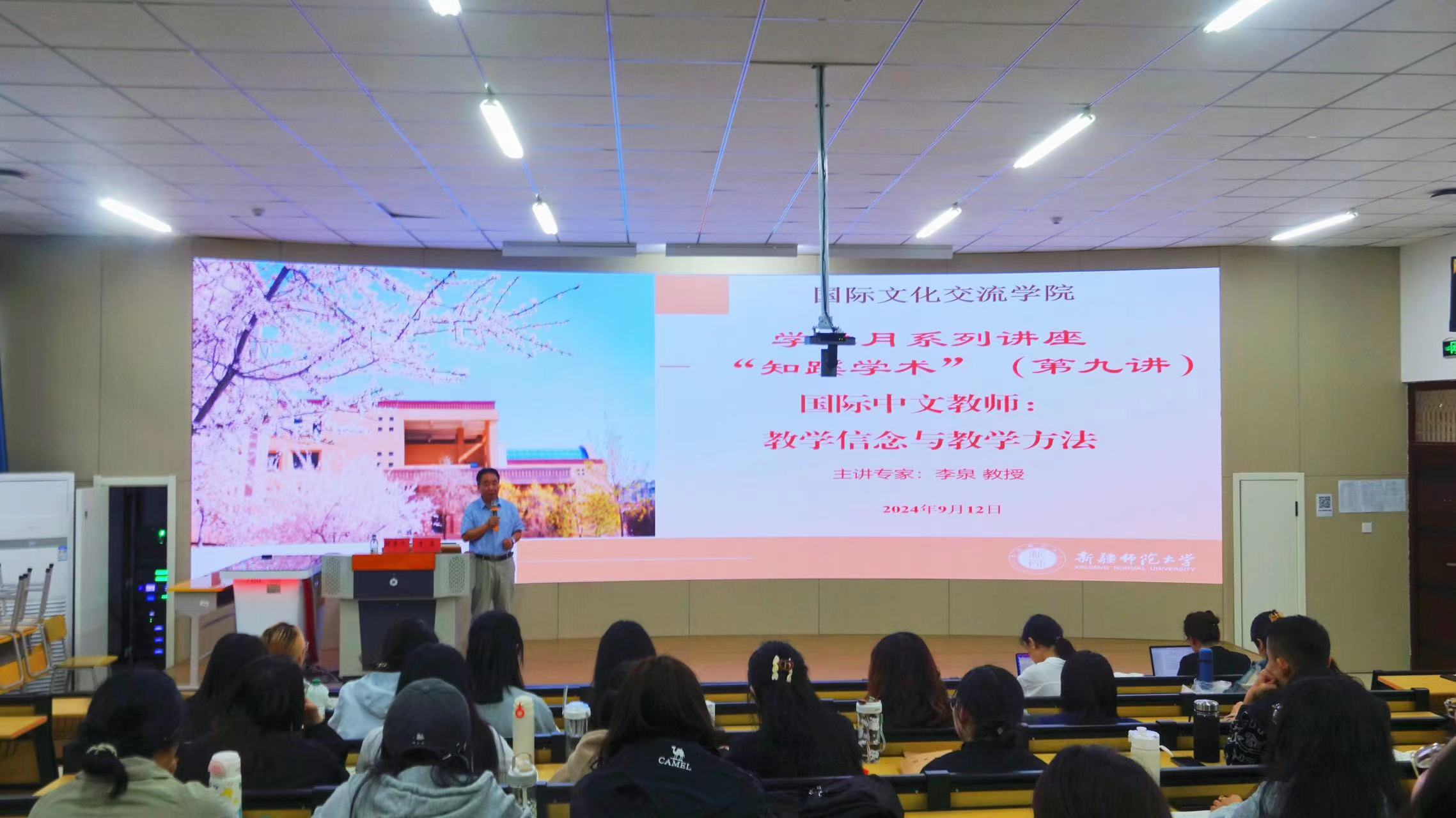系列学术讲座——“知蹊学术”(第九讲)在温泉校区4号教学楼118室顺利举办。学院邀请中国人民大学李泉教授做了题为《国际中文教师:教学信念与教学方法》的专题讲座。学院老师和全体硕士研究生聆听了此次讲座。讲座由学院副院长邓新主持。